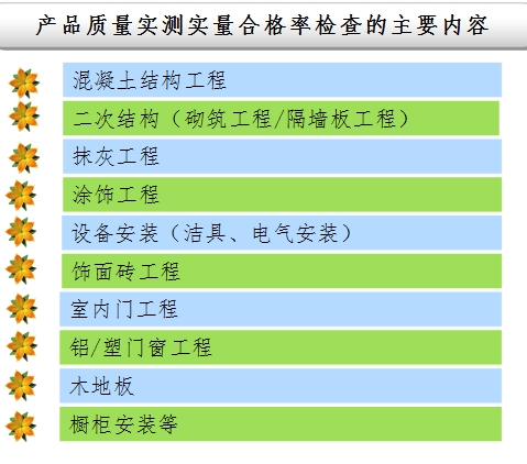 通过对在施工程各个阶段实测和观感的检查,对质量通病情况以及成品保护情况进行评价,衡量项目风险。加强工程质量管理,提高工程品质。(二)促进施工单位 查找客观问题客观反映工程存在真实问题,使施工单位边查边改、即查即改,杜绝未整改的问题被埋在工程中,形成真实隐性永久问题,致带病工程交给业主。(三)督促监理单位 履行岗位职责客观反映工程存在真实问题,使监理单位清晰认识到还存在那些问题,还有那些地方需要改进的地方,起到督促作用。通过“第三方”查、看、测、评等翔实的评估,建设单位细致认真整改工作后,再按照国家相关标准对在建工程实施分户验收,从而使工程质量能够达到交房标准,树立建设单位在市场中良好企业形象,进一步提高企业效益。二、实测实量施工项目前期,针对项目工程过程中每个节点(混凝土工程、砌筑工程、粉刷工程、门窗工程、防水工程、外墙工程及安全文明施工等)进行质量及安全抽查、把控。找出共性及个性问题,组织甲方工程部、监理单位、施工单位等进行质量安全会议,杜绝此类问题的再次发生。同时对监理、施工企业在施工过程中自检、互检、交接检等数据进行核查,防止工程资料数据与工程质量现场脱节,从而起到真正的监督作用。服务对象:开发企业项目、政府安置房项目。优点:杜绝交房前,项目工程工期紧,施工人员不足,质量问题整改困难甚至无法整改。而在施工过程中参与,发现问题及时整改,并及时对现场施工人员培训,以免再犯。从而规范施工、促进产品质量提升。也避免后期返修造成连带巨额经济损失。效果:通过合作企业对工程质量前后期对比,工程质量及安全明显提升,监理职能明显增强,企业工程质量安全监督不再是口号,而是真正落实到实处。案例:亚泰房地产、力旺地产、新发房地产、金逸房地产、高新房地产等。三、分户验收在项目施工后期,项目交付前1-2个月,按照国家规范及业主视角,对房屋质量进行全面检查,(主要是质量通病问题、安装问题。使用功能问题、观感问题、业主关心的问题、重大安全质量隐患问题等等)对验收问题进行汇总,找出个性及共性问题,督促施工单位进行针对性整改,整改后进行复查到位,出具合格的验收报告,从而避免质量问题引起业主投诉,曝光、赔偿等交房风险,塑造企业品牌口碑。服务对象:开发企业项目、政府安置房项目。优点:以业主的视角提前验收,避免交房时,发现问题引起业主投诉、曝光造成经济损失,及社会品牌影响。效果:通过合作企业对交房工作进行前后期对比,工程质量明显提升,户均质量问题条数从以前几十条、上百条到现在几条,交房质量恶性事件投诉、媒体曝光为零,交房满意度大大提升。案例:政府、部队,保利房地产、万龙地产、新发房地产等。(一)“第三方”分户验收(预验房)对开发企业意义第三方分户验收(预验房),是在开发企业完成房屋建造至房屋交付小区业主前的时间段内,邀请第三方专业验房公司对预交付使用的房屋进行验收的过程。验房公司是独立于开发企业和业主之外的第三方,能够以客观、公正的理念,对房屋进行专业化、高标准检测,第三方分户验收(预验房)这个过程能够让开发企业在交房之前了解房屋的真实情况,使存在问题得到及时整改,有效规避自建自查的弊端,达到最终交付的房屋更加适用、完美,即树立了口碑、又保证了利益最大化。1. 了解合同履行 保障合法权益第三方查验,能够为开发企业提供房屋建筑质量检测等各方工作质量的客观、全面真实的信息。验房报告能够体现房屋质量存在哪些问题,从而了施工方履行合同是否到位、开发企业权益是否得到保障等。2. 排查隐性问题 保证工程质量第三方查验,不仅有利于开发企业及时发现问题,而且将以最小的、甚至无代价地把问题及时消除,使开发企业工作容易处于主动地位。业主入住前,施工方既未撤离,同时其质量保证金尚在自己手中,此时发现问题,可责令施工方及时整改,省时、省力、省财,而一旦施工方离开,开发企业对商品房的质量将承担无可推卸的责任。3. 提高内控水平 增强品牌效应第三方查验,能够充分体现开发企业执行国家分户验收规定的力度。同时有利于开发企业及时责成施工单位恪尽职守,不断完善产品质量,降低客户“无理由退房”及投诉率,从而赢得客户信赖,获得更大的、持久的经济和社会效益。验房公司的工作既是对竣工的民用建设工程质量等进行检验,也是对单个终端产品一户一验的结果性检验。在房地产市场竞争日益白热化的背景下,谁首先重视质量细节和产品品质,谁就容易获得良好口碑和信誉,就能赢得消费者信赖,从而为自身获得更大的、持久的经济和社会效益打下坚实的基础。4. 解决物业难题 提升服务品质第三方查验,能给与开发企业有利益关系的物业公司减少很多麻烦和资源消耗。房屋问题若在业主入住后发现,开发企业的形象和信誉必然在消费者心中大打折扣,而这还不可避免地给物业公司的后续服务带来许多麻烦,甚至是人、财、物的不必要消耗。第三方验房机构提前发现产品瑕疵、缺陷,开发企业及时责成施工等有关责任单位整改,开发企业和物业公司双方都轻松,提前处理了房屋质量相关问题,提升了住宅质量品质,达到了国家住宅交付标准,使购房者愉快收房入住,受益最大的是